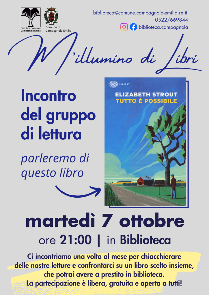 Il settimo appuntamento per il 2025 del gruppo di lettura “M’illumino di libri” è in programma per martedì 7 ottobre, alle 21 in biblioteca, per condividere le impressioni sul libro Tutto è possibile, di Elizabeth Strout, Einaudi edizioni.