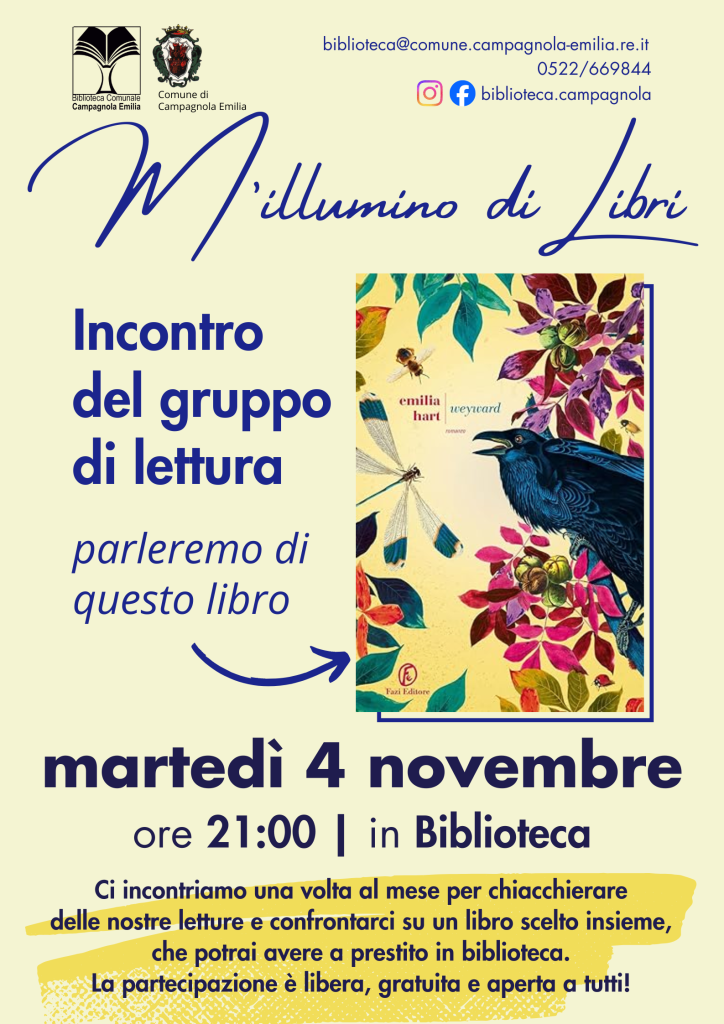 L’ottavo appuntamento per il 2025 del gruppo di lettura “M’illumino di libri” è in programma per martedì 4 novembre, alle 21 in biblioteca, per condividere le impressioni sul libro Weyward, di Emilia Hart, Fazi edizioni.