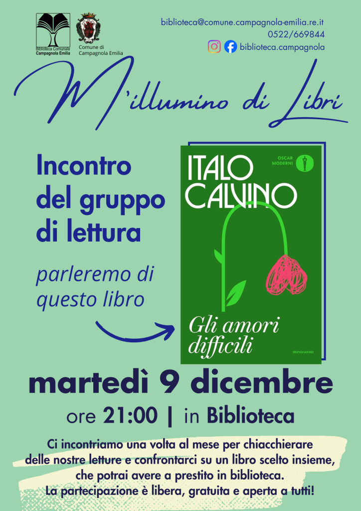 L’ultimo appuntamento per il 2025 del gruppo di lettura “M’illumino di libri” è in programma per martedì 9 dicembre, alle 21 in biblioteca, per condividere le impressioni sul libro Gli amori difficili, di Italo Calvino, Mondadori edizioni.
