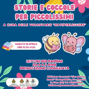 Letture per bambini da 0 A 3 anni, con prenotazione consigliata, a cura delle volontarie “Natiperleggere”.
